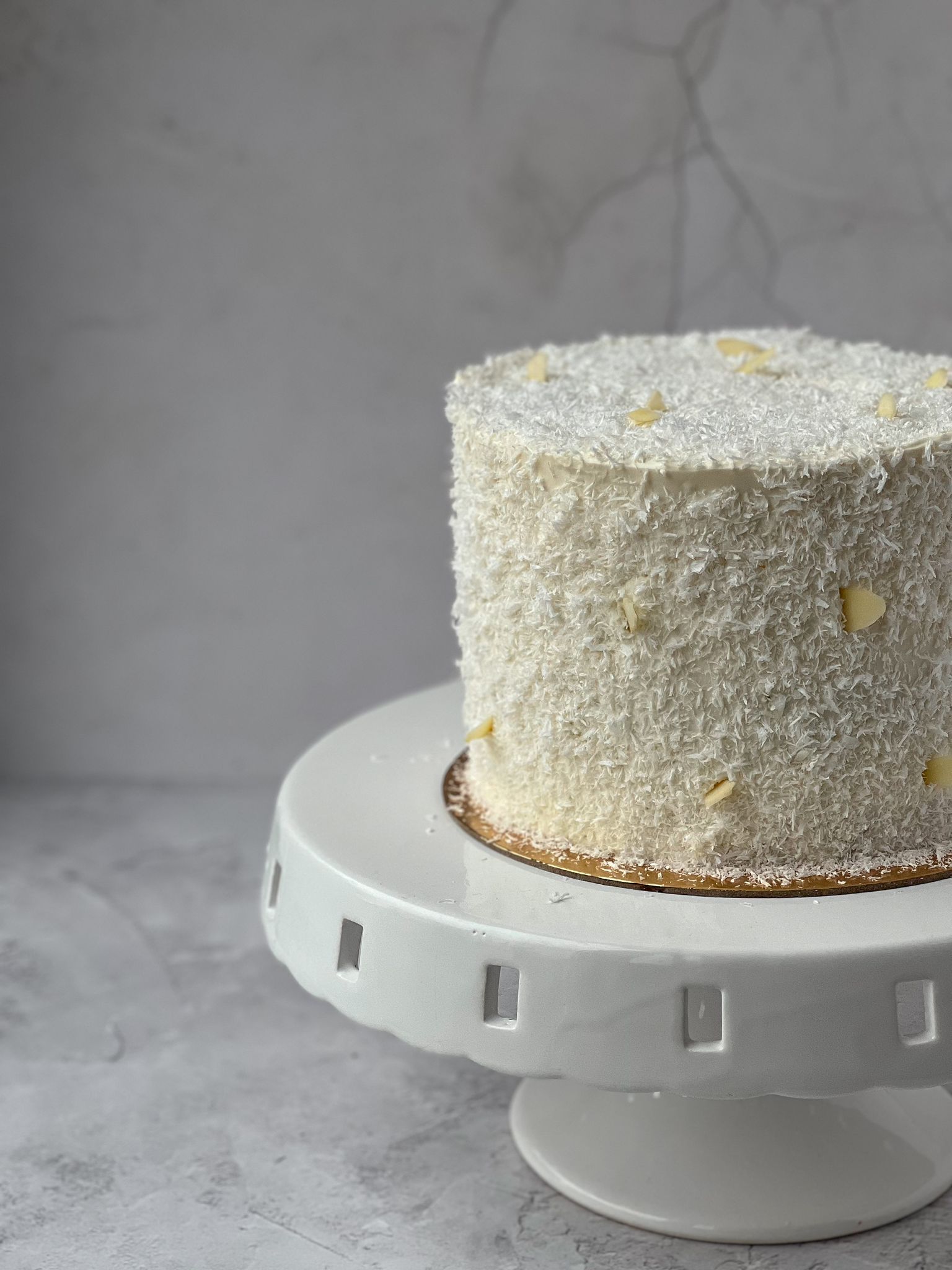 Blat de vanilie însiropat cu lapte, îmbrăcat în cremă Raffaello si inserție de ciocolată albă cu boabe Tonka și migdale. Un gust rafinat, ideal pentru iubitorii de cocos, alune si vanilie.